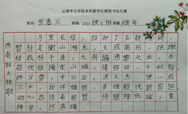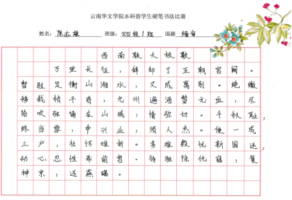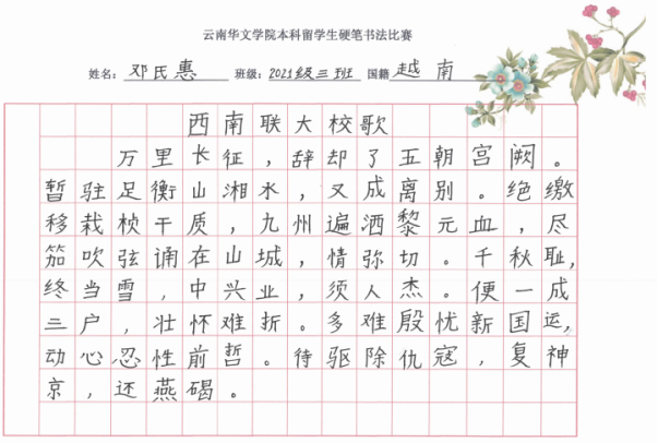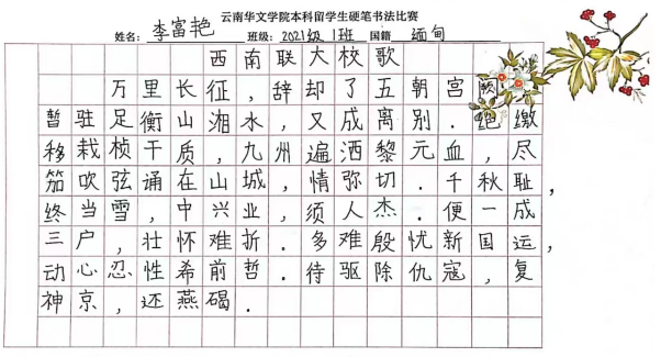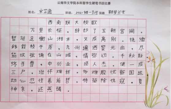 为了提高公司本科国际员工的汉语书写兴趣,进一步普及规范汉字书写,培养国际员工良好的书写习惯,2021-2022学年下学期,公司组织了2021级本科国际员工硬笔书法比赛。经过班级初赛和班主任推荐,公司对16个优秀作品进行了评选,评选出一等奖2个、二等奖4个和三等奖6个。获奖名单如下: