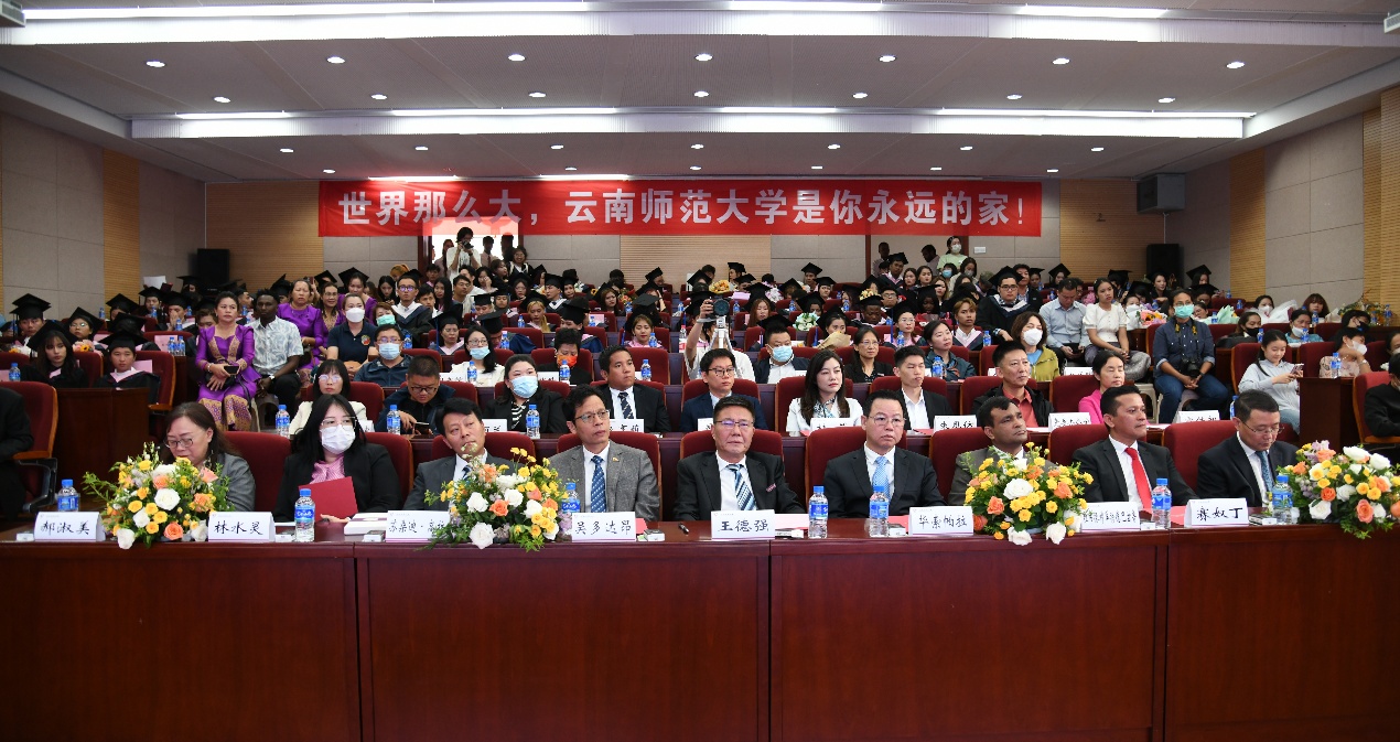 典礼在2023届国际员工自编、自导、自演的“留学云师”纪念视频中拉开帷幕,跌宕起伏的情节,记录了他们的青春和在云南师大留学的难忘岁月,欢呼声与掌声此起彼伏,现场所有人都被这个精彩的视频所感染。