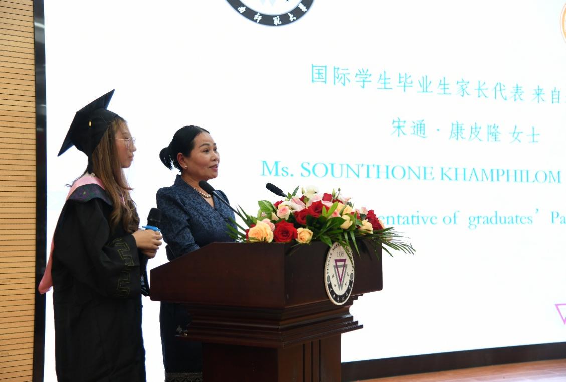 老挝的龙玲同学家长宋通·康皮隆女士作为毕业员工家长代表发言,对毕业的学子送上祝福,向公司的领导老师的培养关怀表示感谢。