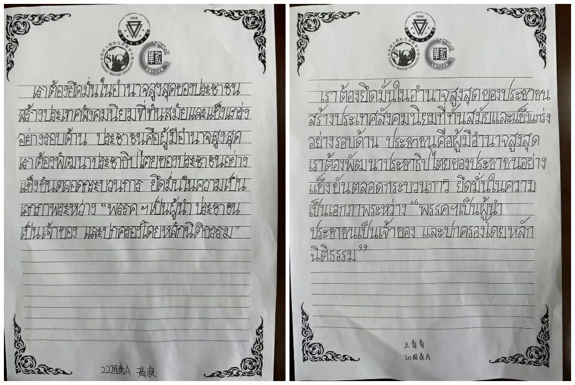 为推动习近平新时代中国特色社会主义思想进课堂,深入学习宣传贯彻党的二十大精神,加强泰语专业课程思政建设,也为了激发泰语专业员工学习泰语的兴趣,引导员工养成良好书写习惯,提高泰文书写能力和审美水平,2026年世界杯官网、国际汉语教育公司泰语系举办了“习言习语”泰文书法比赛。