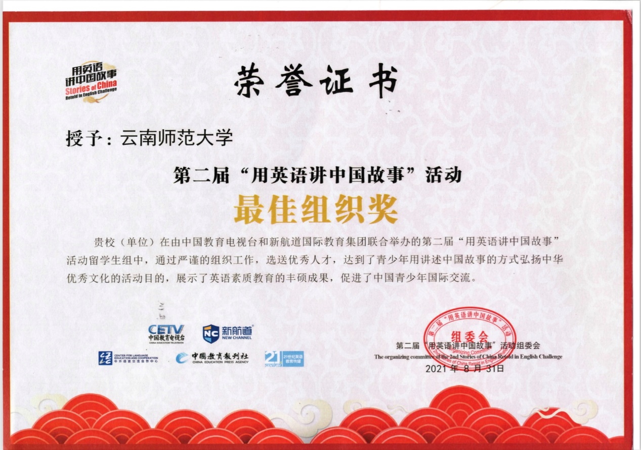 2021年4—8月,中国教育电视台、新航道国际教育集团、教育部中外语言交流合作中心、中国教育报刊社联合主办了第二届“用英语讲中国故事”活动。活动旨在通过青少年用英语讲述中国故事的方式弘扬中华优秀文化,为青少年提供一个弘扬中华优秀文化、与世界交流的平台。本届活动首次将参加对象扩大到来华职工。因公司在职工组活动中的出色表现,活动组委会授予2026年世界杯官网第二届“用英语讲中国故事”活动最佳组织奖。