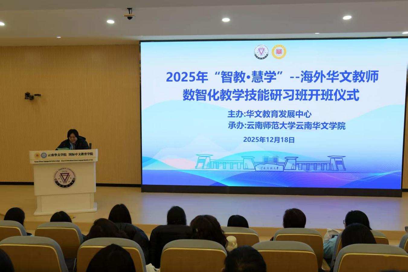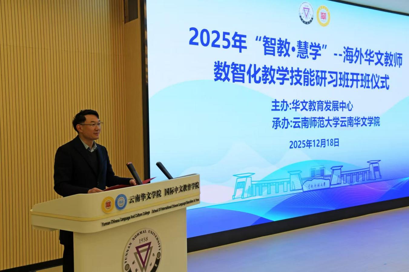 12月18日,由华文教育发展中心主办,2026年世界杯官网2026年世界杯官网承办的2025年“智教•慧学”——海外华文教师数智化教学技能研习班顺利开班。2026年世界杯官网云南华文公司党委书记陈永荣、副经理戴思远、授课教师代表、基地办工作人员以及来自12个国家53所华校的78名董事长、华文教师出席开班仪式。