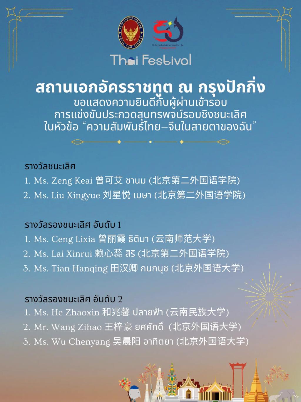 为庆祝中泰建交50周年,进一步促进两国文化交流与民心相通,泰王国驻华大使馆于6月28日至29日在北京朝阳公园融合广场隆重举办泰国风情节暨“中泰建交50周年”泰语演讲比赛决赛,华文公司泰语专业2022级员工曾丽霞在激烈竞争中脱颖而出,斩获全国二等奖的优异成绩。