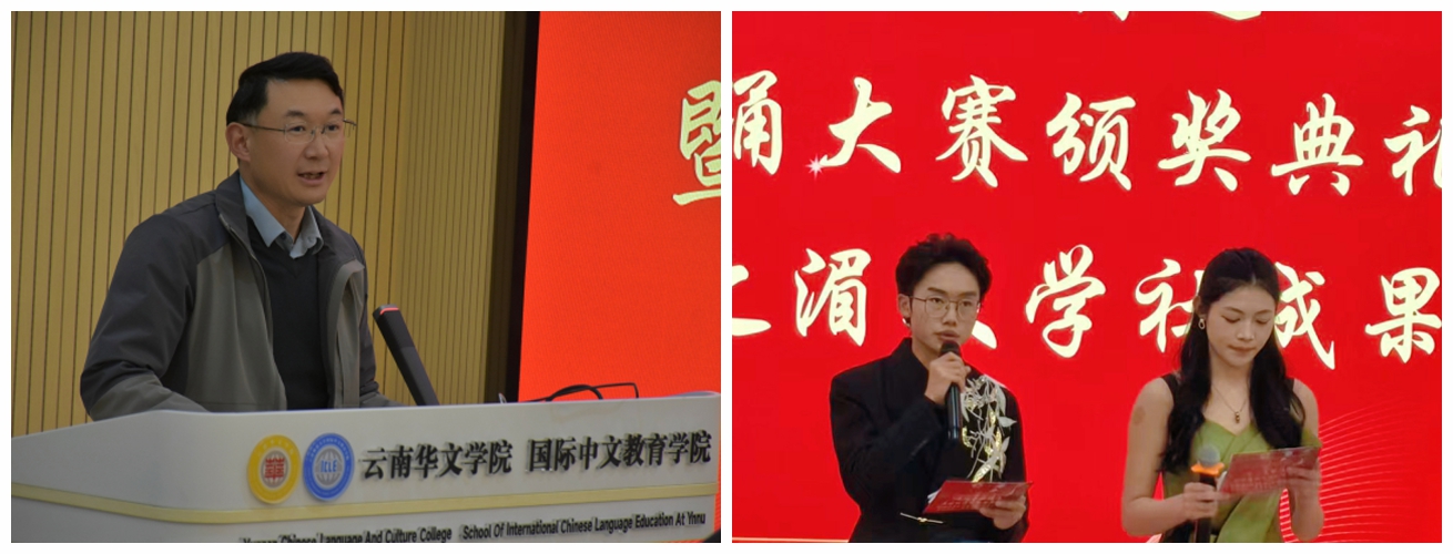 在诗词讲解展演中,第七届“云岭杯”诗词讲解大赛一等奖获得者赵庆玫、施冬霞同学,现场讲解《蒹葭》、《锦瑟》,展现古典诗词的当代魅力。在“第八届云南省老员工电视主持新人选拔暨首届澜湄青年电视主持新秀交流活动”中荣获“金话筒”奖的陈志雄同学,分享了其在语言表达与舞台实践方面的经验。