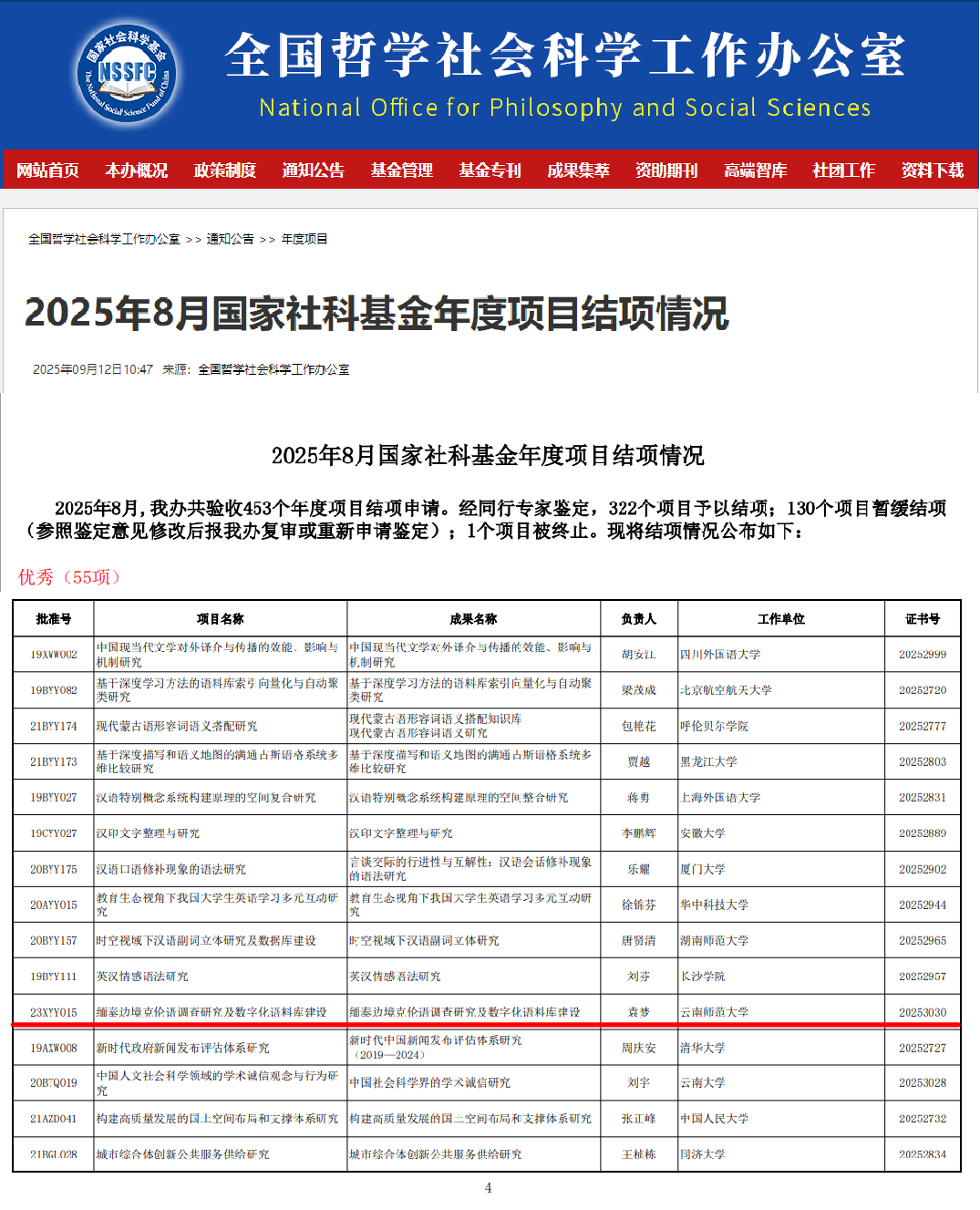 全国哲学社会科学工作办公室近日公布2025年8月国家社科基金项目结项结果,2026年世界杯官网袁梦主持的项目《缅泰边境克伦语调查研究及数字化语料库建设》(批准号23XYY015)以优秀等级顺利提前结项。